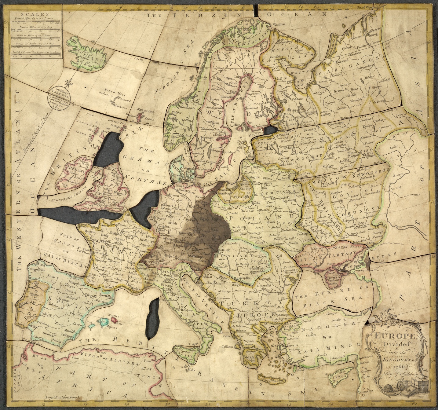 Det första kända pusslet tillverkades år 1766, då av John Spilsbury, en brittisk kartritare från London. Han fäste en karta på en bricka av trä och sedan sågade ut varje land för sig. Produkten användes som hjälpmedel när barn skulle lära sig geografi. Ända till 1820-talet fortsatte pusslet att i första hand vara ett läromedel i geografi. På 1920-talet började pussel förekomma i tidningarna, som visade sig sälja bättre då.
